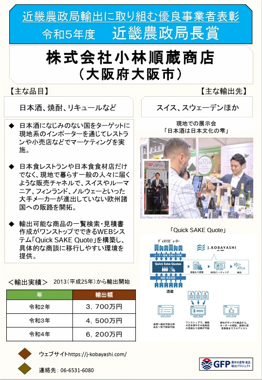 「令和5年度近畿農政局輸出に取り組む優良事業者表彰」における近畿農政局長賞の受賞者について:近畿農政局 (maff.go.jp)